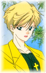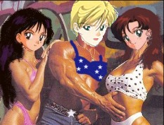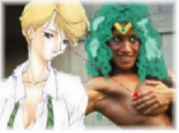 Haruka: ¡¡¿Qué?!! ¡¡Ese es un estúpido fotomontaje!! ¡¡Pensé que me preguntarías acerca de mi fama...! ¡Esa no es Michiru! ¡Ella no tiene los senos como una pelota de goma barata!Rei: ¡Ajá! ¿¡Entonces si le has visto los senos a Michiru?!
